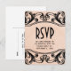 Elégante et chic Vintage Swirls RSVP carte postale avec un arrière - plan de corail orangé truffé et tourbillonnantes bordures florissantes. Ce design ancien est parfait pour un mariage à thème vintage. Facile à customiser, il suffit d'ajouter les détails de votre mariage dans les champs de texte fournis. Cliquez sur "Customiser" pour trouver d'autres options de personnalisation.