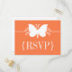 Carte Postale de réponse Mariage à l'effervescence de papillon douce et simple avec une jolie silhouette de papillon et une bordure tourbillonnante. Cette carte postale RSVP classe est le choix parfait pour la mariée qui veut quelque chose d'élégant et moderne pour son mariage. Facile à customiser, ajoutez simplement les détails de votre journée très spéciale dans les champs fournis. Cliquez sur le bouton "Customiser" pour jouer avec les polices ou les couleurs de texte ou ajouter/supprimer du texte pour donner à ce design votre touche personnelle.