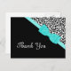 Chic aqua et noir merci cartes postales avec un empreinte de léopard moderne noir et blanc et un ruban bleu marine attaché dans un arc élégant. Image imprimée plate, pas l'arc réel.