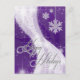 Un beau design de Noël orné présente un ruban blanc enneigé de lumière et d'étoiles sur un fond violet foncé riche damassé. Trois flocons de neige blancs sont suspendus dans le coin supérieur droit, et un script fluide dit Joyeuses Fêtes.