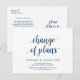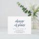 Il s'agit de la moderne minimaliste simple design thème, en police bleu marine, invitation de mariage Rescheduled (reporté / report) carte postale (changement de plans). C'est la façon parfaite et élégante de faire le faire-part reprogrammé à vos amis et votre famille.