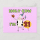 Texte : "Vache sainte J'ai 21 ans" sur des T-shirts, des tasses, des cartes, des boutons, des magnets, des timbres-poste, et d'autres vêtements et cadeaux de 21 ans avec une jolie vache caricaturale dans un casquette de fête tenant un cadeau d'anniversaire et un cupcake d'anniversaire !