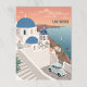 affiche de voyage de Santorin, Grèce. Montrez les bâtiments emblématiques blanchis à la chaux avec des dômes bleus qui descendent en cascade à flanc de falaise d'Oia au coucher du soleil. Incluez une mer Égée d'un bleu profond avec quelques voiliers et un ciel rose doré. Cadre avec des vignes bougainvillières et des ombres douces pour accentuer la chaleur méditerranéenne. Utilisez des lignes nettes, des tons pastel vectoriels et une police serif élégante pour 'Santorini'."