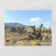 Montré est une image photographique du paysage stérile du désert de Mojave montrant une végétation clairsemée, un terrain sec, des Joshua éparpillés et des montagnes dans l'arrière - plan.