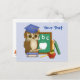 Chouette mignonne aux yeux en mortier avec pomme, livres et autres outils de retour à l'école. Zone de texte de couverture de Personnaliser.
