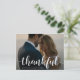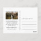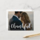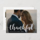 Une photo moderne et élégante merci carte postale conçue pour accommoder votre photo mariage horizontale ou paysagère préférée avec "remerciant" comme un script de calligraphie blanche superposition. Personnalisez avec vos noms et/ou la date mariage en dessous. Les cartes postales sont inversées pour montrer votre adresse de retour avec suffisamment d'espace pour l'adressage du destinataire, ainsi qu'un message pré-imprimé et une photo supplémentaire en option. Si vous préférez ajouter un message manuscrit, supprimez simplement l'exemple de texte affiché.