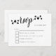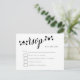 Un moyen pratique pour vos invités à RSVP à vos invitations est par carte postale avec vos coordonnées déjà là pour qu'ils puissent simplement compléter le front et le retourner dans le poste à vous. Ce design élégant a RSVP en écriture minuscule avec des swashes sur la première et la dernière lettre avec 6 feuilles en forme de coeur à chaque extrémité. Le reste du texte est facilement personnalisable, y compris votre nom de retour et les détails de l'adresse au verso.