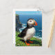 A sweet puffin postcard that has a cute illustration of a puffin sitting by the sea on an seaside dune or ledge.