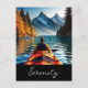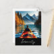 Restez en contact avec cette carte postale montrant un homme en kayak à travers les montagnes et la forêt.
