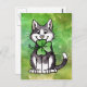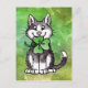 Un chat noir et blanc tenant un shamrock à trois feuilles dans sa bouche, pour la Saint Patrick, ou juste pour le plaisir !
