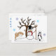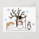 Cette carte postale présente des Huskies sibériens qui jouent dans la neige avec un bonhomme de neige et qui tombent des flocons de neige.