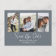 Ce design comprend une photo simple minimaliste bleu poussiéreux, trois photo simple élégant, multi photo photo couple photo photo photo photo fiançailles, un mariage moderne élégant, fiançailles photos budget carte postale, script de brosse calligraphie, minimaliste typographie script calligraphie, script de brosse moderne simpliste, un budget facile enregistrer la date, une élégance simpliste enregistrer la date