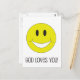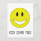 Cette carte postale inspirante, heureuse et chrétienne présente un visage souriant avec le texte "Dieu vous aime !".