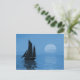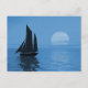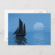 Un bateau naviguant sur un océan calme avec le soleil glissant à l'horizon. L'ensemble est dans les tons bleus du soir.
