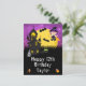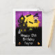 Cette carte d'anniversaire amusante et effrayante peut être personnalisée avec un nom ou un titre, comme fille, petite-fille, nièce, amie, etc. Elle présente une sorcière mignonne à côté d'une maison hantée tordue. En arrière-plan, il y a une pleine lune avec des chauves-souris et un ciel nocturne violet avec des étoiles. Le texte combine des polices décoratives et serif pour un look élégant et moderne. C'est parfait pour Halloween.