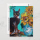 Chat noir expressif, capricieux, tournesols colorés et feuilles verts dans les couleurs jaune et bleu turquoise. Peinture acrylique originale artistique et vibrante sur panneau en bois par Bulgan Lumini (c)