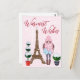 Cette belle carte postale parisienne présente la Tour Eiffel avec une fille totalement chic portant un foulard qui dit "It's Winter Baby" à côté de topiaires enneigés. Les flocons blancs tombent dans l'arrière - plan qui a des éléments monochromatiques avec le texte "Warmest Wives".