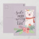 La commande est arrivée très rapidement et le produit correspond totalement à mes attentes. Cette carte postale est vraiment mignonne et je l'ai offerte à une amie pour les Fêtes. Image de la meilleure qualité. Bon format de carte postale et carton très résistant.