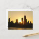 L'horizon de Chicago est encadré par la lueur jaune et orange du coucher du soleil, avec le soleil qui s'étend entre les bâtiments. L'eau du lac Michigan reflète également la lumière du coucher du soleil.