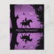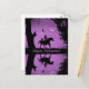 Une carte postale amusante Happy Halloween. Image imaginaire d'une sorcière chevauchant une licorne avec des corbeaux, des chouettes et un chat noir, le tout encadré par un grand chêne et une lune de croissant. Super mignon et capricieux, envoyez un peu de magie d'Halloween avec cette carte postale amusante.
