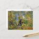Carte postale d'art avec la peinture aquarelle de Winslow Homer (1836-1910) Sur le sentier (1889). Scène forestière d'un homme qui chasse avec son chien de repérage noir et blanc.