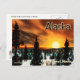 L'hiver dans la taïga arctique. Avec le soleil bas à l'horizon la neige brille et le ciel brûle orange et jaune. Le texte "Alaska" apparaît également. Ajoutez votre propre texte supplémentaire.