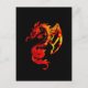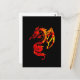 une oeuvre décorative d'un dragon aux couleurs flamboyantes rouge et orange sur une carte postale noire.