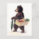Ours en peluche avec une corbeille de pommes et un légume vert feuilleté sous un bras et un parapluie dans sa patte sur une illustration vintage tirée d'un livre pour enfants de 1907.