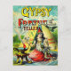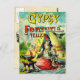Illustration vintage colorée d'une belle caissière tzigane. Elle est assise devant une tente et tient des cartes à sa main droite. Une chouette vole à proximité.
