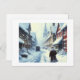 Une scène de rue enneigée présente une personne marchant avec une canne, entourée de bâtiments enneigés et d'une lointaine calèche. La lumière douce émane des fenêtres, créant une atmosphère cosy et vintage.