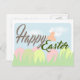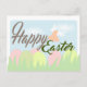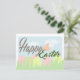 Une carte heureuse sensible de Pâques Joyeuses Pâques avec la cloche, les oeufs et l'herbe dans des couleurs en pastel tendres.