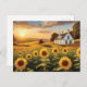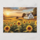 Une ferme blanche se trouve sur une colline surplombant un vaste terrain de tournesol au coucher du soleil avec des collines ondoyantes dans l'arrière - plan, créant un cadre rural chaleureux et idyllique avec une atmosphère paisible.