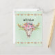 Une carte postale chic hippy boho avec un crâne de vache à thème du sud-ouest tribal et arrangement floral en aquarelles. Les fleurs sont une collection colorée dont l'orange rose et le rouge. Une bordure en forme de losange dans une couleur brunâtre de bronze orne le dessus et le bas de cette carte. Texte dit le Texas avec 2 étoiles dessinées à la main de chaque côté. L'arrière - plan est de couleur vert clair.
