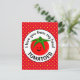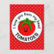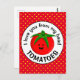 Tomate rouge vif et ronde mignonne avec cinq feuilles verts pour les cheveux et un visage souriant heureux. Au-dessus et au-dessous de la tomate se trouve un drôle de jeu de mots en noir qui dit "Je t'aime de mes tomates à la tête". L'arrière - plan est rouge avec un motif rétro de pois jaunes.