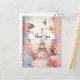 Carte de remerciement avec une image stylisée de la tour Eiffel entourée de jolis papillons et de délicates fleurs de jardin.