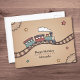 Une carte d'anniversaire représentant une illustration d'un train en bois souriant cahotant le long d'une voie ferrée sinueuse. Le fond de la carte est un beige texturé en dégradé chaud avec des détails subtils comme des engrenages en bois et des étoiles dessinées à la main. Une belle illustration à envoyer pour l'anniversaire d'un enfant ou celui d'un amateur de jouets en bois.