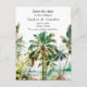 Cette aquarelle élégante et belle à sauver l'invitation de la date dispose d'une plage et des palmiers. Le texte combine écriture manuscrite et polices sans serif pour un look élégant et moderne. Il est parfait pour une plage d'été ou un mariage de destination tropicale.