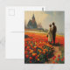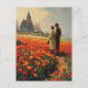 La carte postale capture une scène intemporelle aux Pays-Bas, représentant un couple se promenant à travers un champ de tulipes vibrant. Les couleurs éclatent de vie, et au loin, une vieille église ajoute une touche d'histoire au paysage pittoresque. Le mélange de la nature et de l'architecture crée un instantané charmant d'une époque révolue.