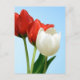 De belles tulipes rouges et blanches contre un arrière - plan bleu pâle sont au centre de cette carte postale à thème de fleurs. Idéal pour rester en contact avec des amis ou ajouter à votre collection. Photo originale reproduite avec l'autorisation de pixabay.com. Adapté par Lisa Marie Robinson.