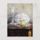 Carte postale d'art avec le tableau de l'artiste français Berthe Morisot (1841-1895) intitulé Tureen and Apple (1877). Une vie impressionniste avec un gobelet en cristal, un tureen bleu et blanc et une pomme verte sur un côté.