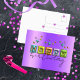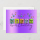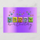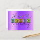Conception unique de carte postale d'anniversaire personnalisée avec le texte JOYEUX écrit dans une typographie 3D gonflée associée à un script manuscrit entièrement personnalisable et des étincelles de couleurs assorties sur un fond métallisé violet.