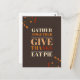 Cette carte postale moderne de Thanksgiving présente un design typographique audacieux et élégant avec les expressions "Rassemblez-vous, donnez-nous grâce, mangez de la tarte" dans des couleurs chaudes d'automne. L'arrière - plan marron foncé et les accents minimalistes des feuilles et des baies apportent une touche contemporaine, ce qui en fait un lieu idéal pour envoyer des salutations festives avec un message ludique et familial.