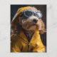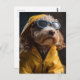 Un chien mignon dans une veste à pluie jaune et lunettes de soleil bleu