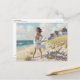 Carte PinUp classique montrant une belle PinUp Girl dans un bikini blanc posant à la plage, peinte par Arthur Sarnoff (1912-2000)