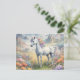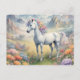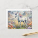 Carte postale montrant une image rêveuse d'une licorne blanche avec une crinière arc-en-ciel debout dans un champ de fleurs. Dans l'arrière - plan se trouvent des montagnes majestueuses. Le cadeau parfait pour donner à ceux qui aiment les licornes magiques et mystiques. Contient du contenu génératif.