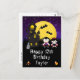 Cette carte d'anniversaire amusante et effrayante peut être personnalisée avec un nom ou un titre, comme fille, petite-fille, nièce, amie, etc. Elle présente de mignons vampires à côté d'une maison hantée tordue. En arrière-plan, il y a une pleine lune avec des chauves-souris et un ciel nocturne violet étoilé. Le texte combine des polices décoratives et serif pour un look élégant et moderne. C'est parfait pour Halloween.
