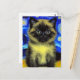 Carte postale avec un chat siamois dans la peinture de Van Gogh Starry Night! Cette beauté moelleuse pose devant un ciel bleu nuit avec lune brillante et étoiles. Un cadeau intime pour les collectionneurs d'art amoureux de les chats et hollandais !