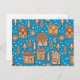 Motif vectoriel tiré à la main avec diverses maisons en pain d'épice, sapins, flocons de neige et biscuits en forme de croissant sur le bleu avec chute de neige