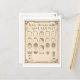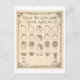 Cette carte postale est une reproduction d'un tableau de barbier vintage montrant différents types de coupes de cheveux et de styles de barbe.