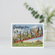 Il s'agit d'une carte postale classique de style vintage qui contient l'expression "Salut du Nebraska". Les grandes lettres stylisées de NEBRASKA contiennent chacune une scène ou un point de repère unique de l'État, y compris le capitole d'État, les terres agricoles rurales et les bâtiments historiques. Le premier plan montre une scène pastorale avec des moutons broutant dans un champ vert. Le design est nostalgique et du milieu du siècle avec sa palette de couleurs rétro et sa police audacieuse, ce qui le rend parfait pour les produits comme les cartes postales, les affiches et les t-shirts pour tous ceux qui aiment l'art du voyage vintage ou la belle situation du Nebraska.